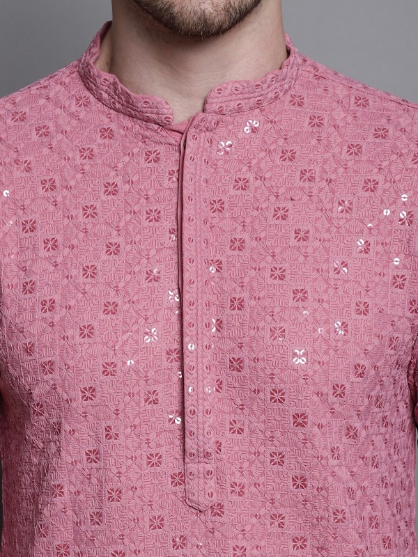 Coral Red Sequins Embroidered Kurta, Coral Red straight above knee kurta, has a mandarin collar, long sleeves, straight hem